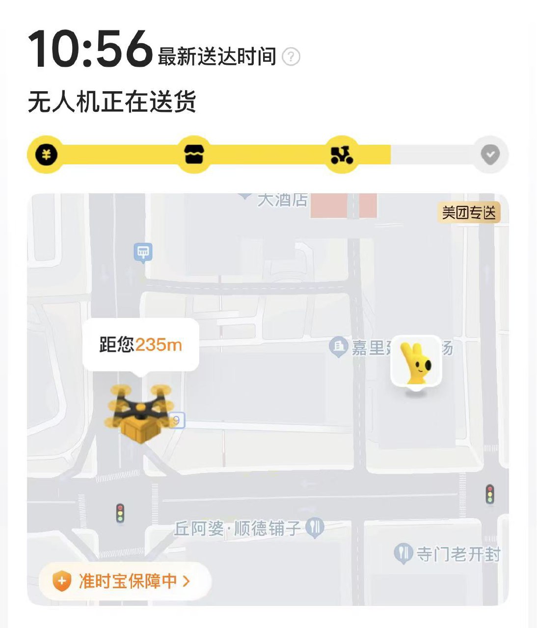 无人机在附近不远的地方有个专用的无人机外卖柜, 柜的顶部是停机坪.