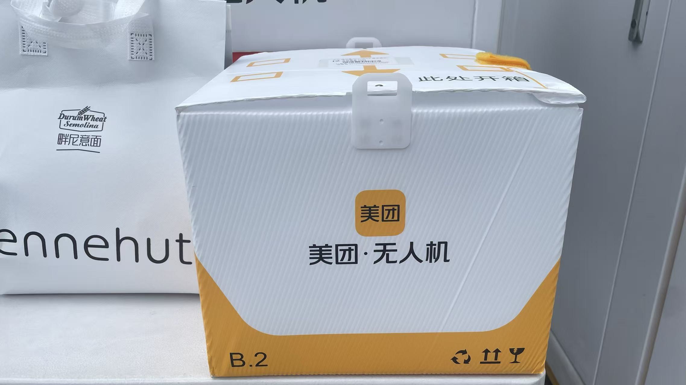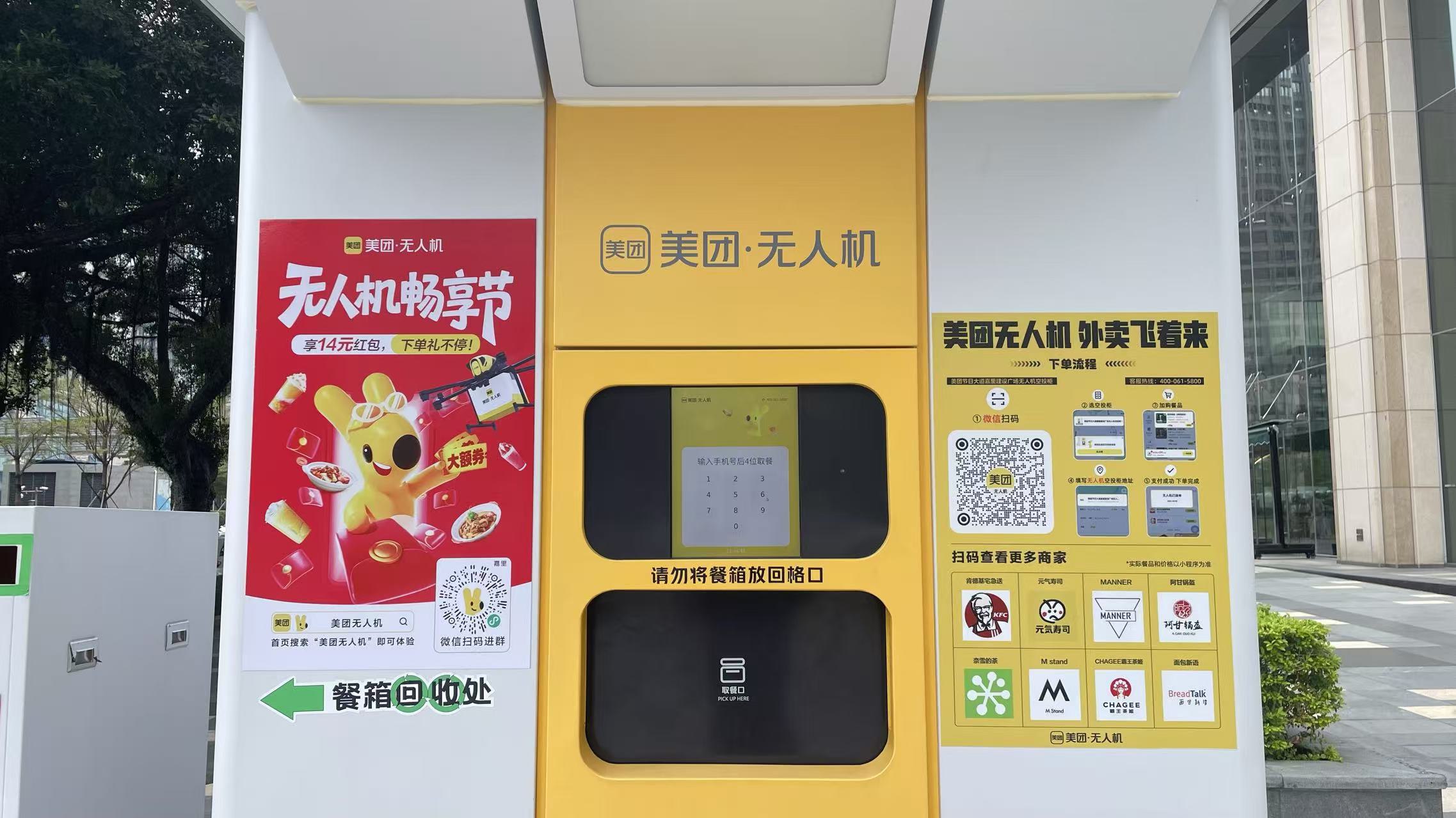 输入手机尾号取餐, 可以看到有专用的无人机包装盒, 取出自己的餐后, 将包装盒拆解后投入旁边的餐盒回收柜即可.